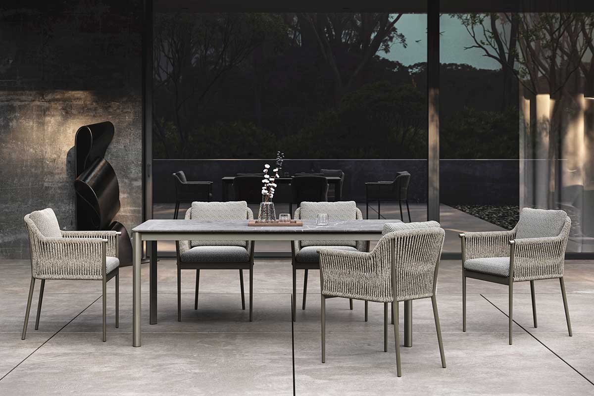 Noor Koleksiyonu, alüminyum ve ip örgü birleşimiyle geniş oturum alanları sunarak dikkat çeker. Oturma grubu, masa grubu, şezlong ve daybed seçenekleriyle modern, dinamik ve işlevsel açık alan tasarımlarını hayata geçirir. Alüminyum destekli iskelet yapısı ve ip örgü detaylarının yüksek kaliteli materyal dengesi, koleksiyonun hem görsel açıdan hem de dayanıklılık bakımından öne çıkmasını sağlar. Noor Koleksiyonu, geleneksel ve modern tasarım anlayışlarını uyum içinde harmanlayarak özgün bir konsept yaratır. Alüminyum ve ip örgü, hafifliği, dayanıklılığı ve estetiği bir araya getirerek koleksiyonun temelini oluşturur.
