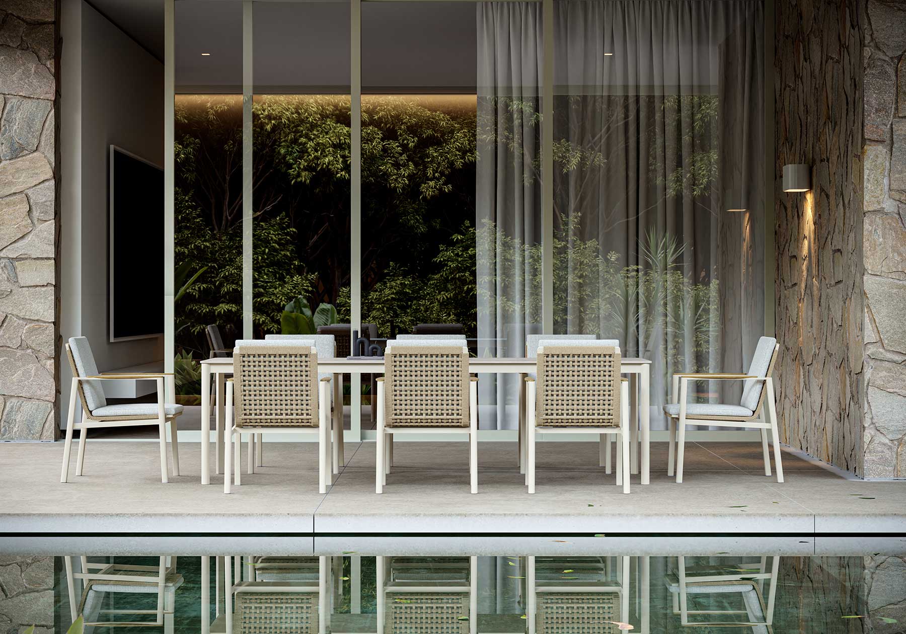 Modern tasarımdan ilham alan Easton Koleksiyonu, sadeliğin gücünü öne çıkarır. Mimarî alüminyum çerçeve, oturma grubunun formunu belirlerken, dayanıklı sentetik rattan materyali her türlü hava koşuluna dayanıklılığını vurgular. Dokuların kesintisiz birleşimi, tasarımdaki eğri ve açıları daha da belirginleştirir. Teak ağacıyla desteklenen kol detayları, koleksiyonu estetik açıdan olduğu kadar oturum konforu açısından da mükemmel bir dengeye kavuşturur. İki farklı renk alternatifiyle sunulan koleksiyon, açık alanlarda oturma grubu, masa grubu ve şezlong seçenekleriyle şıklığı ve fonksiyonu bir araya getirir.
